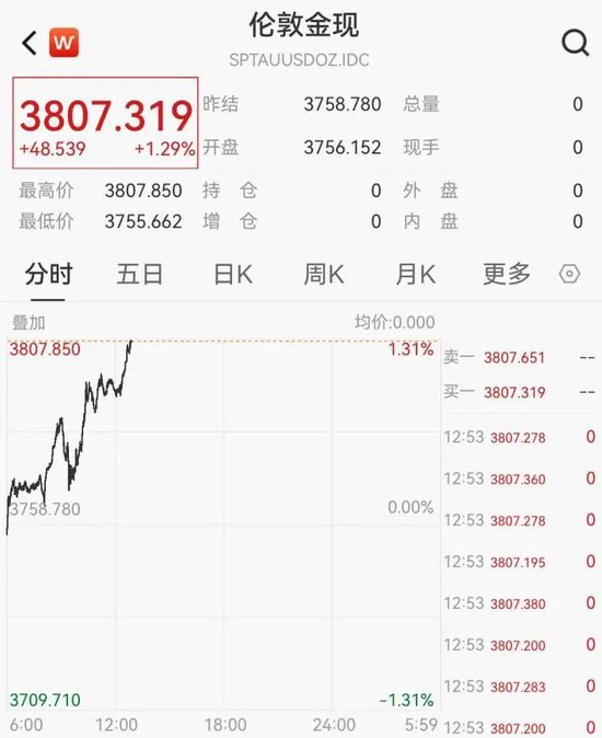 截至记者发稿配配查,现货黄金报3807.319美元/盎司,日内涨1.29%。