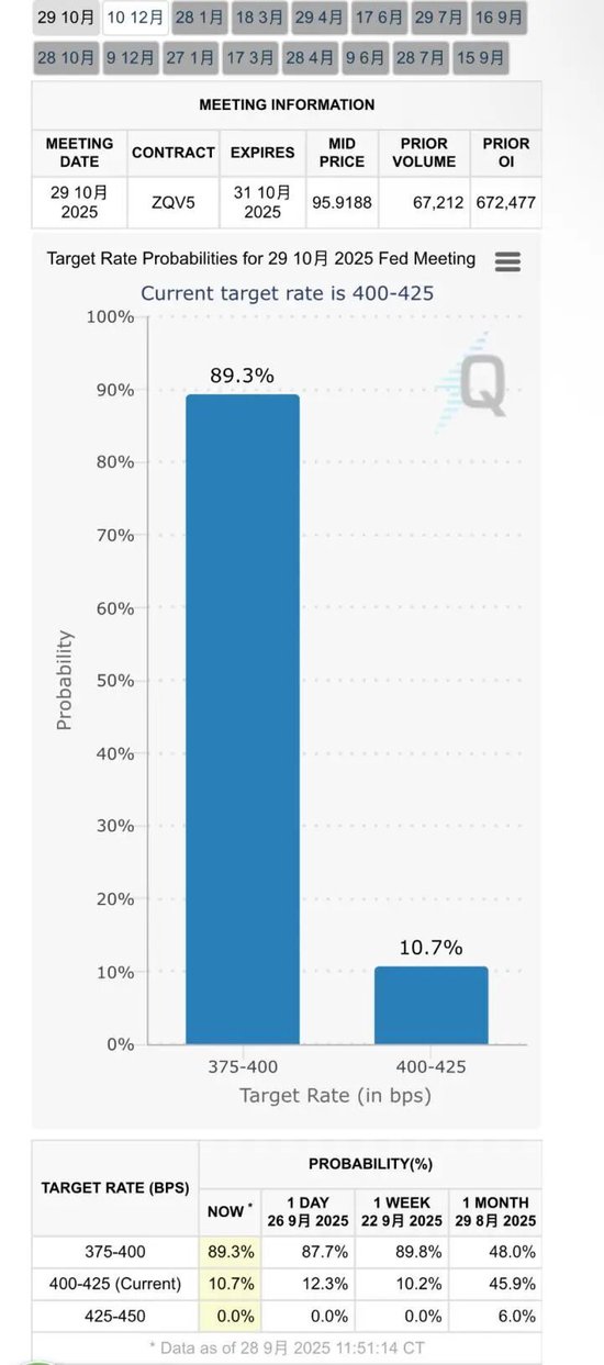 根据CME美联储观察的数据,交易员目前预计美联储10月份降息的可能性为89.3%配配查,12月份降息的可能性约为66.6%。