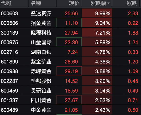盛达资源10cm涨停,招金黄金涨近9%,晓程科技、山金国际、湖南白银等个股跟涨。
