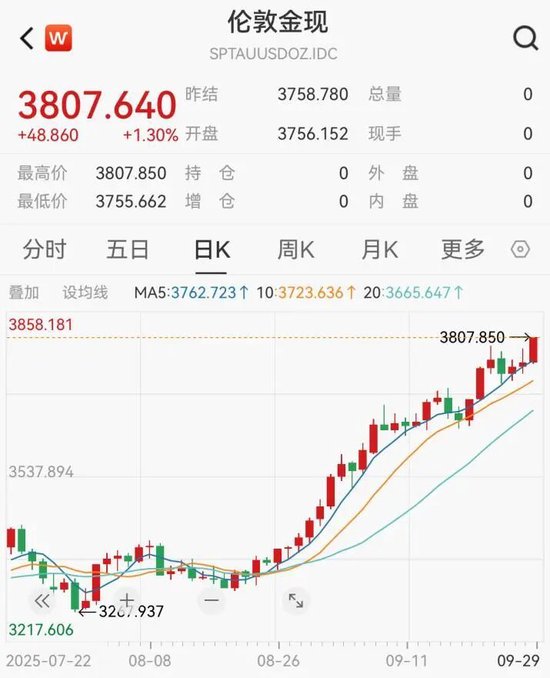 9月29日,现货黄金首次升穿3800美元/盎司,再创历史纪录。